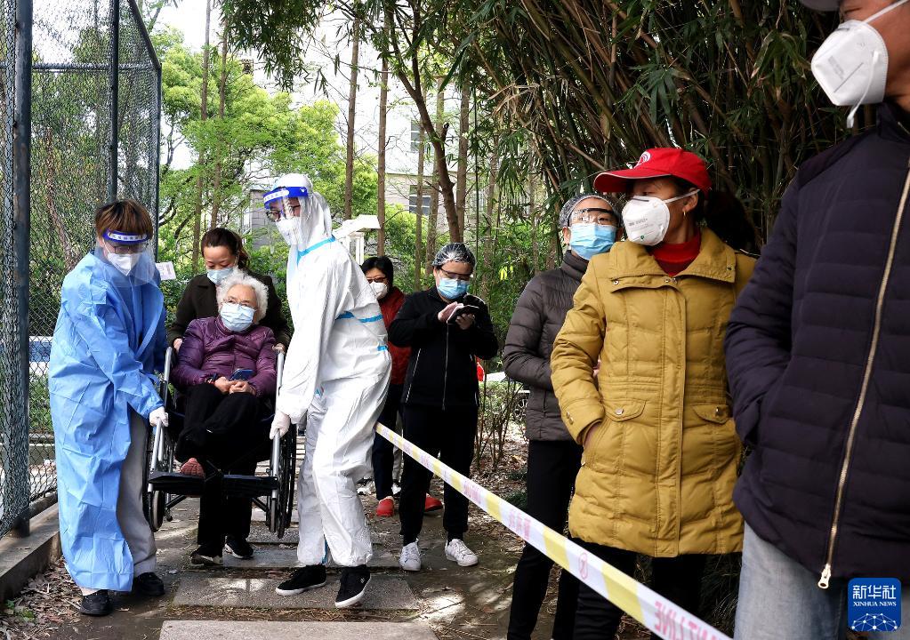 4月4日,社区志愿者协助行动不便的老人袁秀清出门检测核酸。