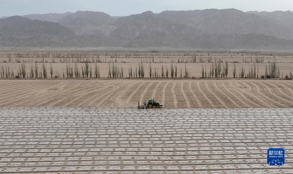 4月8日,在新疆巴音郭楞蒙古自治州博湖县博斯腾湖乡库代力克村棉田里,棉农使用装有北斗卫星导航系统的播种机播种棉种(无人机照片)。