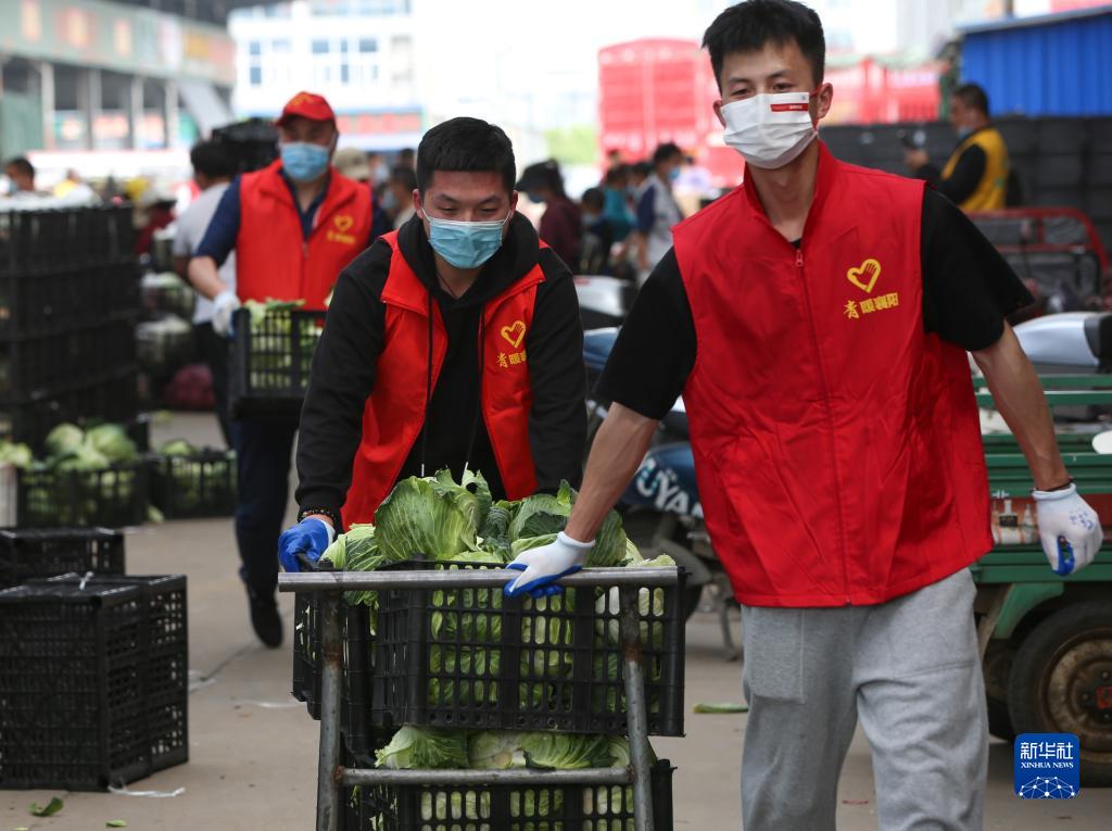 4月9日,在湖北省襄阳市竹叶山农产品交易中心,志愿者在分拣蔬菜。