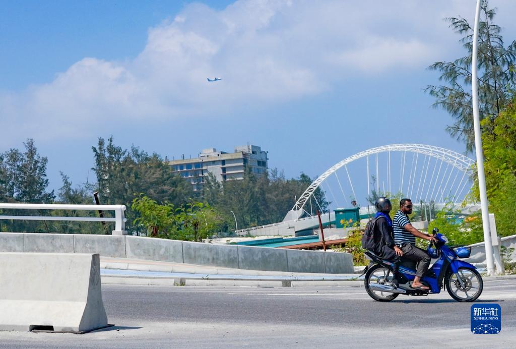这是1月7日,人们在马尔代夫胡鲁马累的五桥项目中的一座桥上通行。