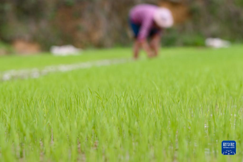 4月10日,村民在贵州省黔东南苗族侗族自治州岑巩县天星乡地城村管护秧苗。