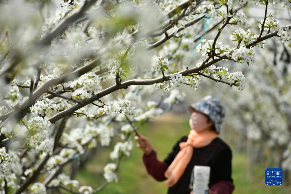 4月10日,梨农在河北沧州泊头市洼里王镇后高尧村梨园给梨树授粉。