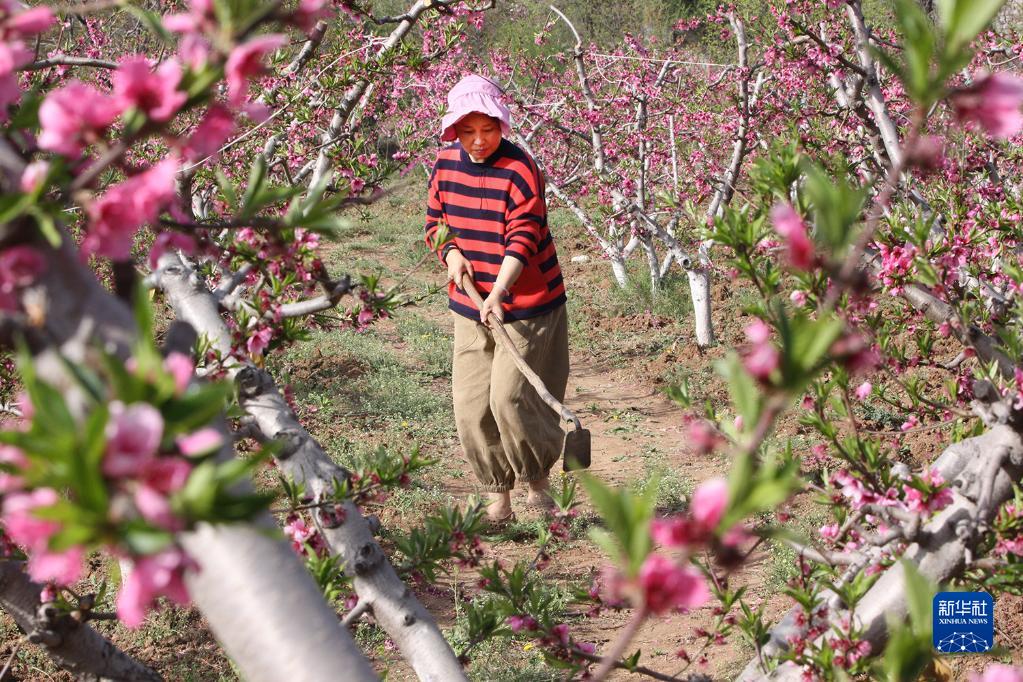 4月10日,河南省焦作市博爱县寨豁乡玄坛庙村,果农们在冬桃园里锄草。