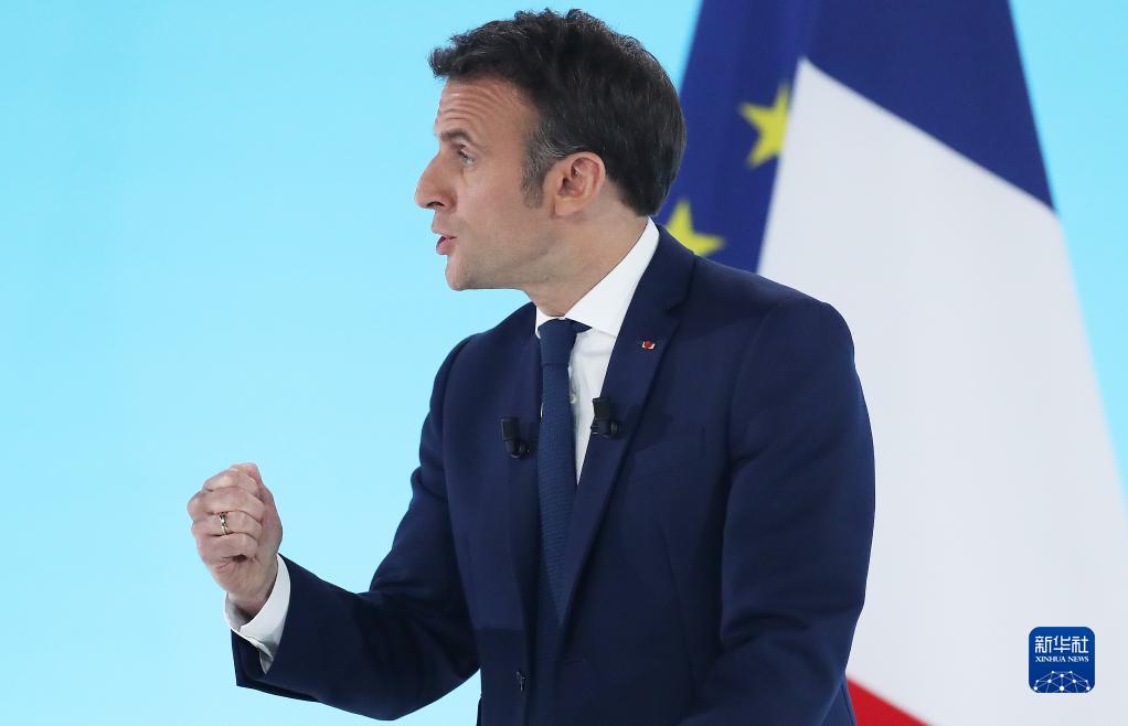 4月10日,法国总统马克龙在巴黎参加总统选举首轮投票后的集会。
