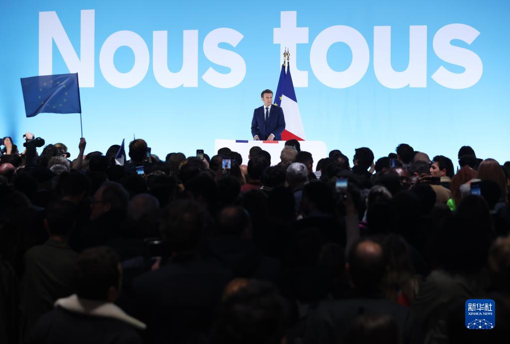 4月10日,法国总统马克龙在巴黎参加总统选举首轮投票后的集会。
