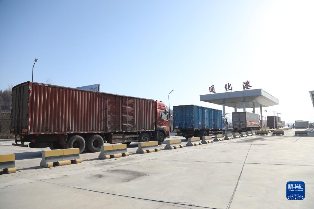 装载着通化市支援长春保供物资的大货车驶向长春(3月28日摄)。