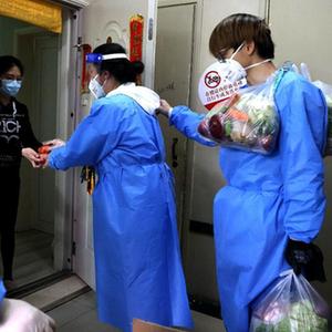4月11日,社区志愿者为居民挨家挨户运送生活物资。