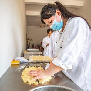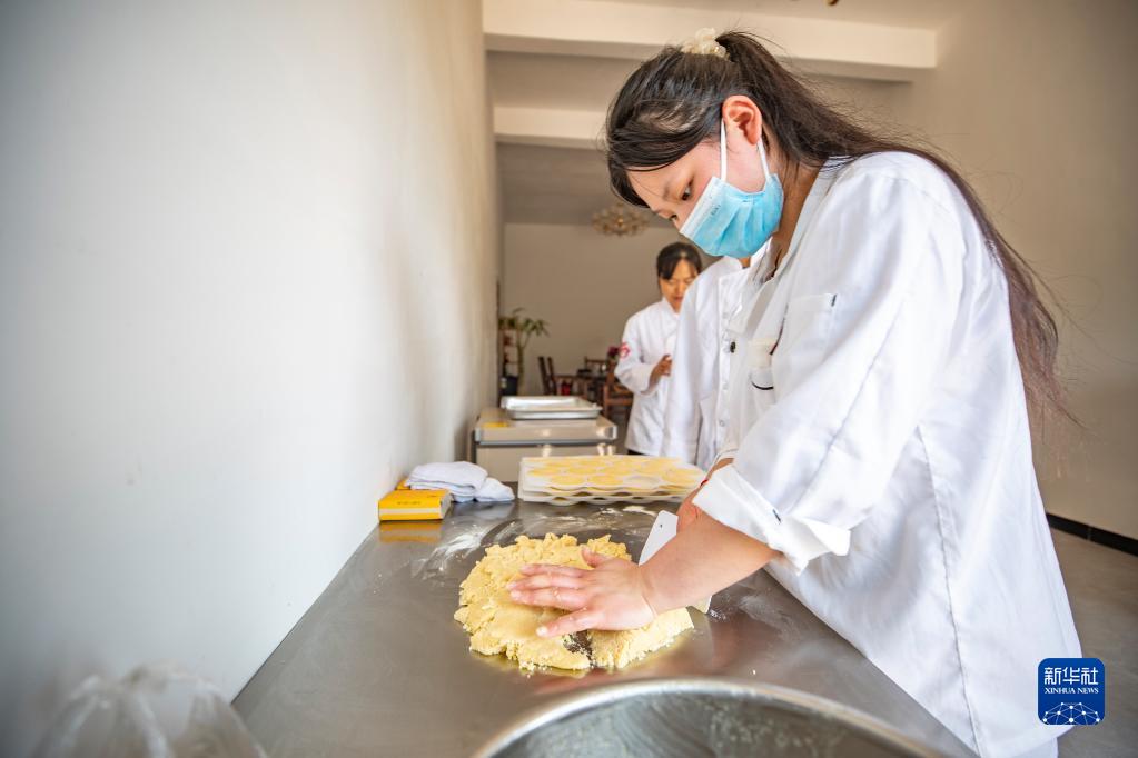 4月11日,在重庆市开州区五通乡桐林村,工作人员在制作牡丹花饼。