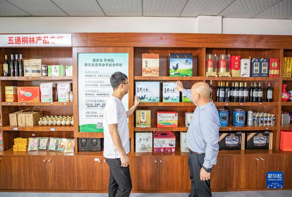 4月10日,在重庆市开州区香石生态农业专业合作社内,店主(右)向消费者介绍桐林专柜的产品。新华社记者 黄伟 摄