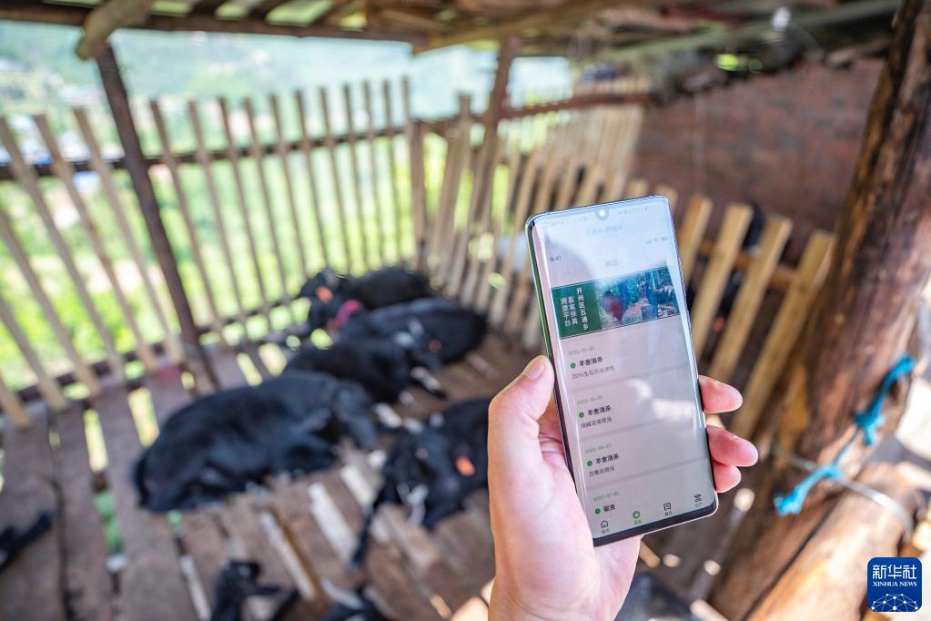 4月11日,在重庆市开州区五通乡桐林村,重庆步步为云科技有限公司技术负责人展示黑山羊智慧耳标上的溯源信息。