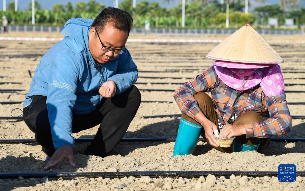 在三亚市崖州区城西村坝头南繁公共试验基地,南京农业大学硕士研究生魏元浩(左)在指导村民种大豆(2021年11月25日摄)。
