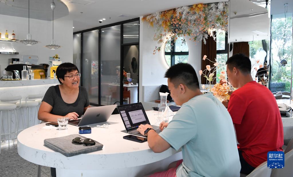中国科学院遗传与发育生物学研究所研究员高彩霞(左)和团队人员在进行探讨(2021年11月24日摄)。