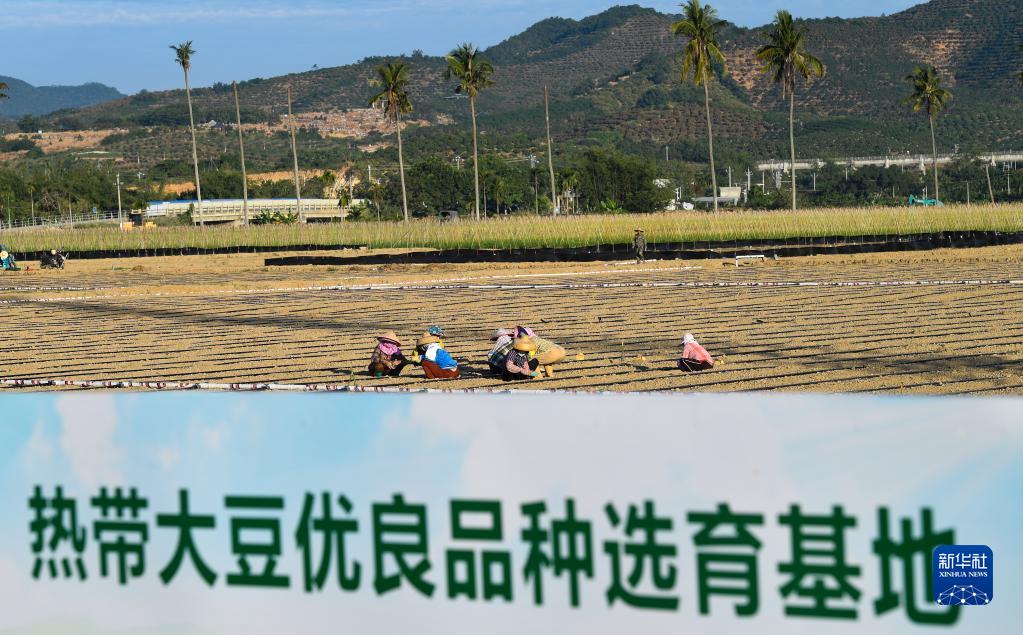 在三亚市崖州区城西村坝头南繁公共试验基地,村民在抢播大豆(2021年11月25日摄)。