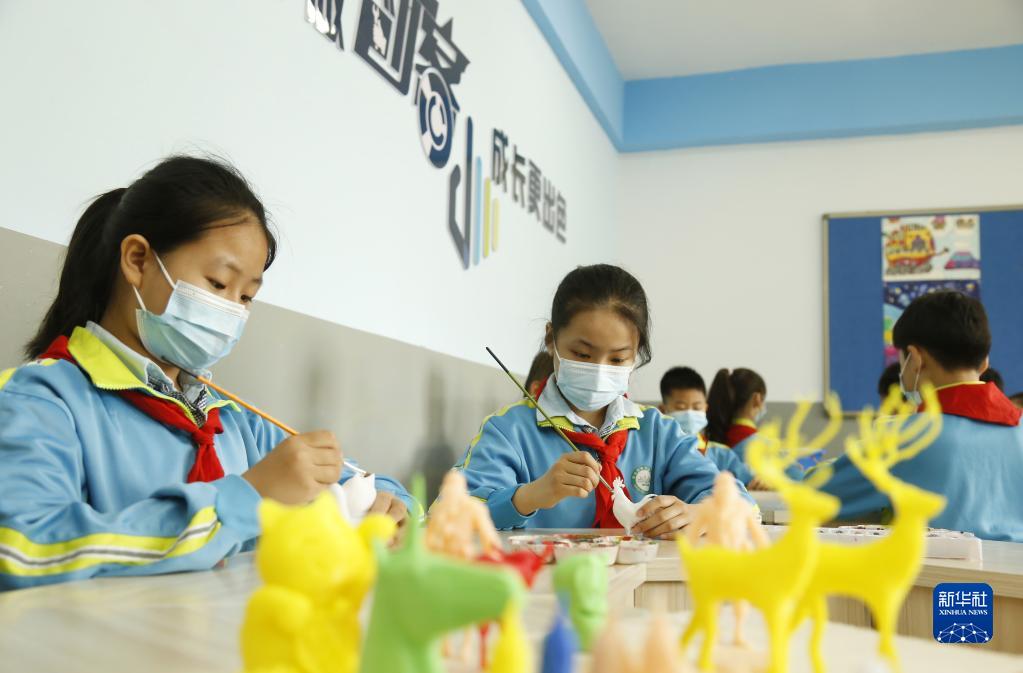 4月13日,邢台市家乐园小学学生在给3D打印模型上色。