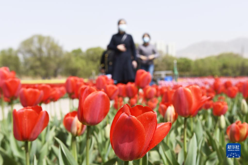 近日,甘肃临夏回族自治州永靖县黄河花堤上种植的大面积郁金香竞相开放,吸引游客前来观赏。