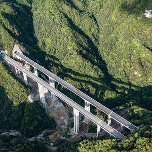 4月13日,工程车辆行驶在兰海高速重遵扩容工程观音塘大桥上(无人机照片)。