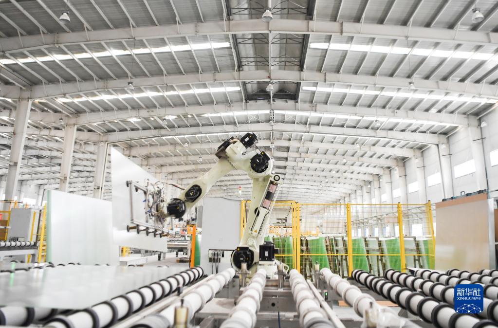 4月13日,工业机器人在彩虹(延安)新能源有限公司光伏玻璃生产线上作业。