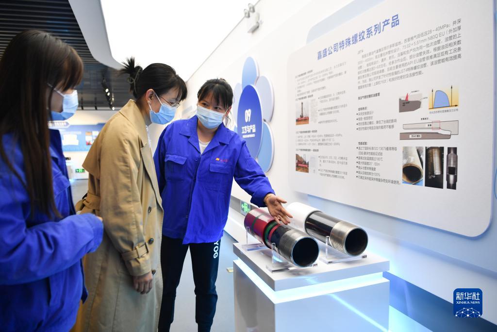 4月13日,延安嘉盛石油机械有限责任公司工作人员(右)向参观者介绍一款石油管材产品。