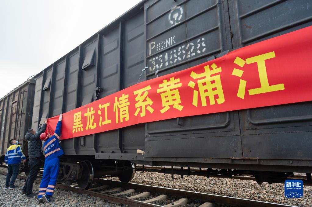 4月14日,在哈尔滨国际集装箱中心站,工作人员在黑龙江省支援上海市抗疫物资专列上悬挂横幅。