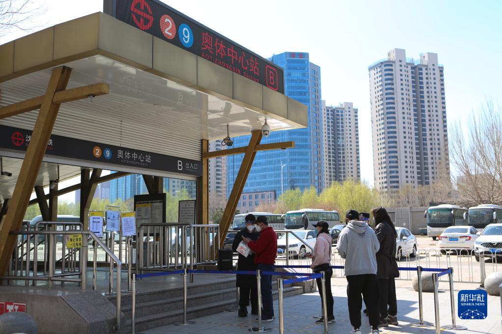 4月13日,在沈阳市奥体中心地铁站,地铁工作人员查验乘车市民的核酸检测阴性证明。