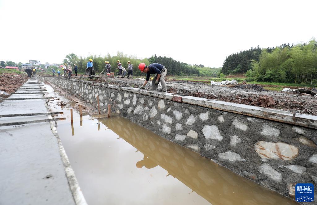 4月14日,在资兴市唐洞街道高牌村,工人进行水利设施施工。