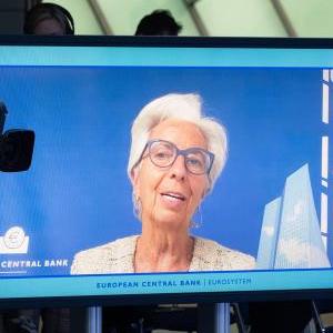 4月14日,欧洲央行行长拉加德以视频方式在德国法兰克福欧洲央行总部举行的新闻发布会上讲话。