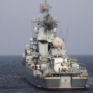 这是2015年12月17日在叙利亚拉塔基亚省塔尔图斯港附近拍摄的“莫斯科”号导弹巡洋舰的资料照片。