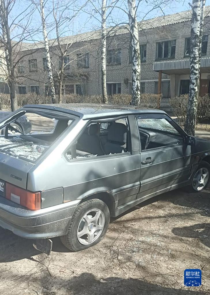 这张4月14日的视频截图显示的是俄罗斯布良斯克地区克利莫沃遭袭后受损的汽车。