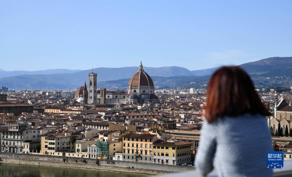 4月14日,一名游客在意大利佛罗伦萨的米开朗琪罗广场俯瞰城市风光。