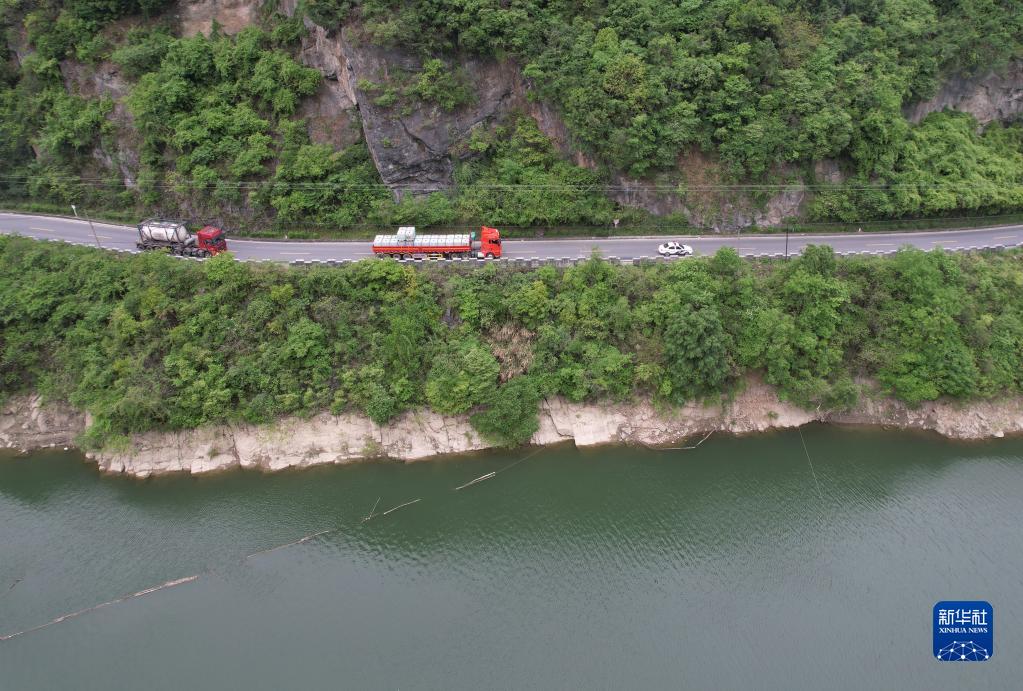 4月14日,在石泉县曾溪镇汉江边的国道上,交警警车护送危化品运输车辆行驶(无人机照片)。