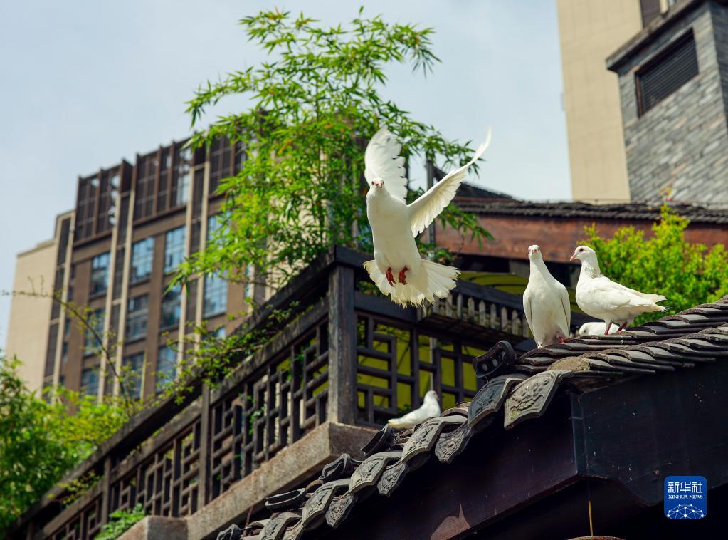 4月13日,在重庆南岸区弹子石老街,鸽子在复建的老建筑屋檐上栖息。