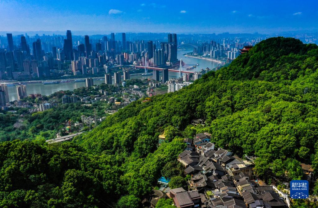 从位于南山上的重庆南岸区黄桷垭老街拍摄的山下的都市(4月13日摄,无人机照片)。