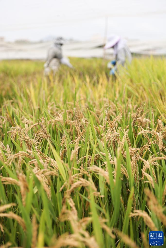 3月31日,于萌(右)和同事在国家南繁科研育种基地里收集水稻种子。