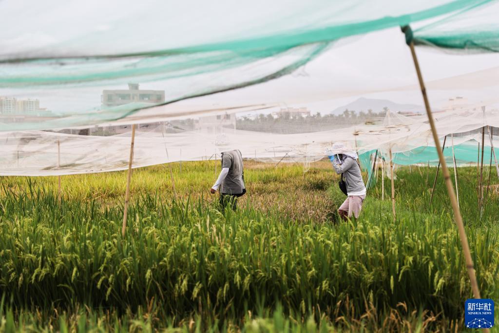 3月31日,于萌(右)和同事走在国家南繁科研育种基地里。