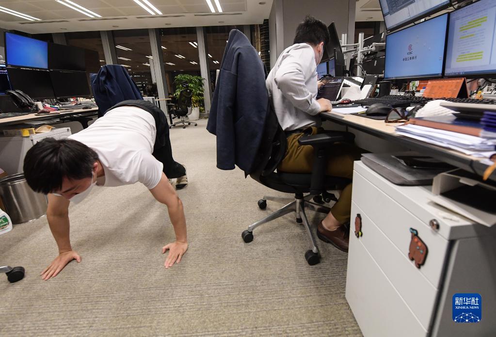 为了保持封闭管理期间的健康,工商银行上海分行金融市场部市场营销科科长黄硕喆(左)在空闲时做起了俯卧撑(4月14日摄)。