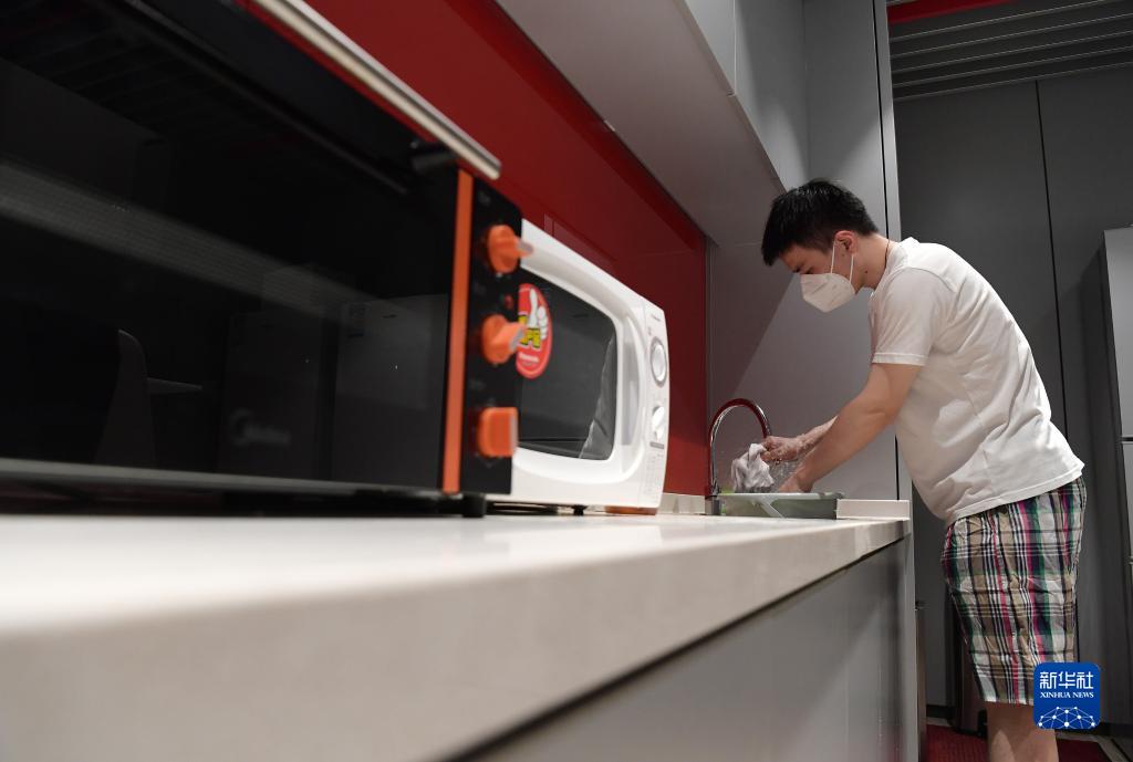 工商银行上海分行金融市场部利率交易员杨波在办公楼内洗衣服(4月14日摄)。