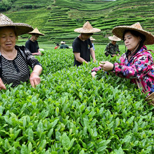 4月15日,茶农在武夷山市星村镇的茶山上采摘新茶。