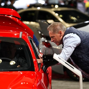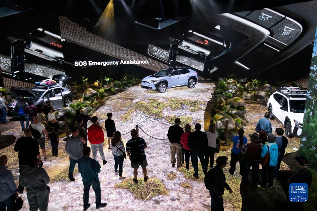 4月15日,参观者在美国纽约国际车展上观看斯巴鲁纯电动车。