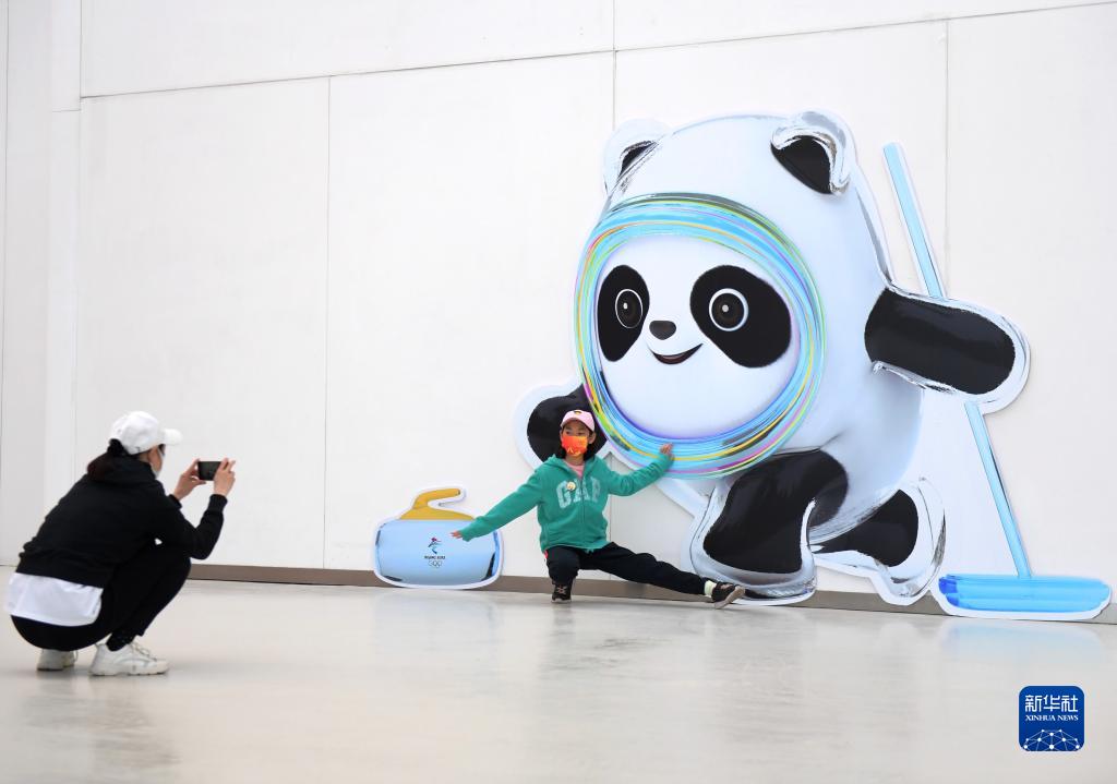 4月16日,小朋友在“冰立方”内与“冰墩墩”合影。新华社记者 张晨霖 摄