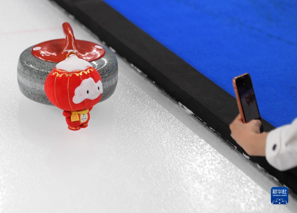 4月16日,观众在“冰立方”内的冰壶赛道旁拍摄“雪容融”。新华社记者 张晨霖 摄