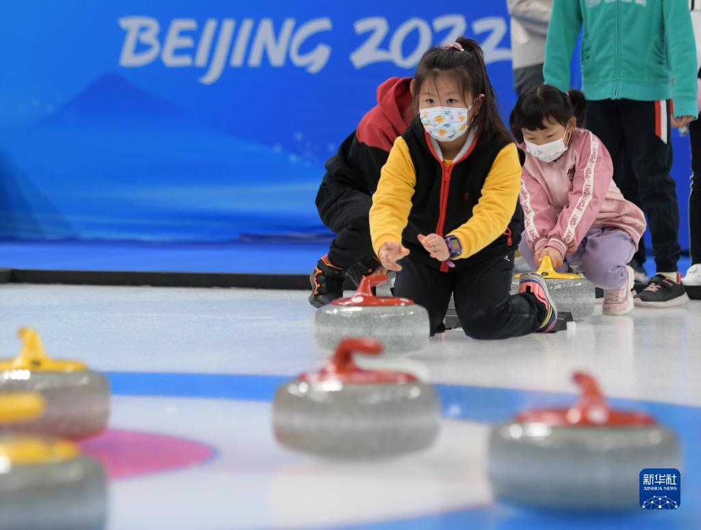 4月16日,小朋友在“冰立方”内体验冰壶运动。新华社记者 张晨霖 摄