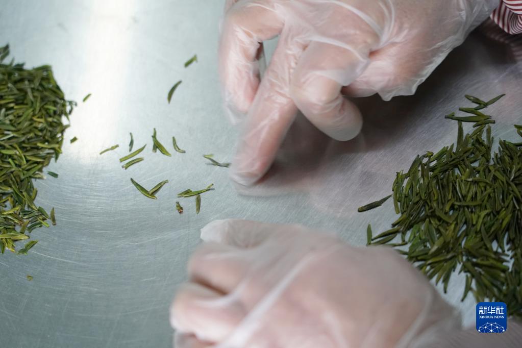 4月15日,在西乡县城北街道一家茶企生产车间内,工人在手工挑选精品茶叶。