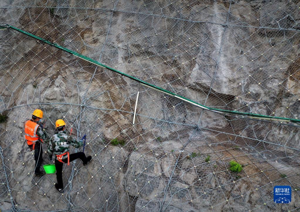 工作人员在洛阳龙门石窟奉先寺安装防护网(4月13日摄,无人机照片)。