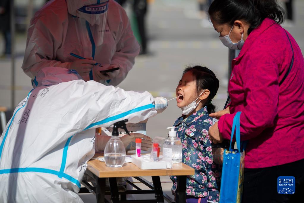 4月16日,在太原市迎泽区桥东街道双塔寺街一社区核酸采样点,工作人员为一名小朋友进行核酸采样。