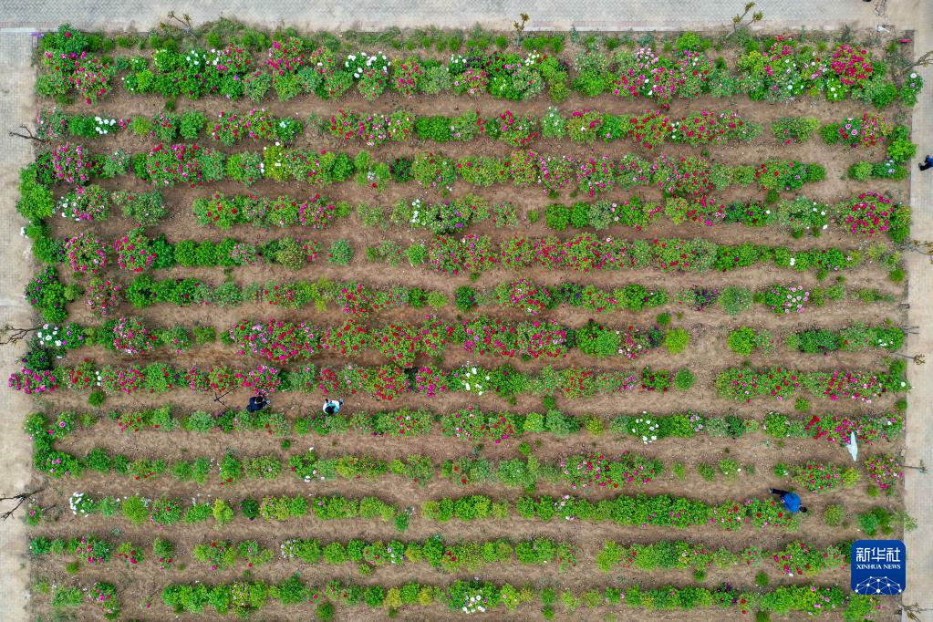 4月14日,参观者在位于山东省菏泽市的一处牡丹种植园内赏花(无人机照片)。