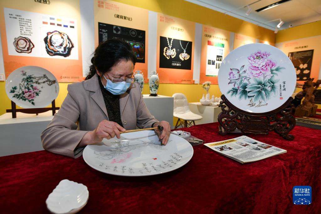 4月15日,在山东省菏泽市市民文化中心,一名工艺美术师在制作牡丹主题的文化创意产品。