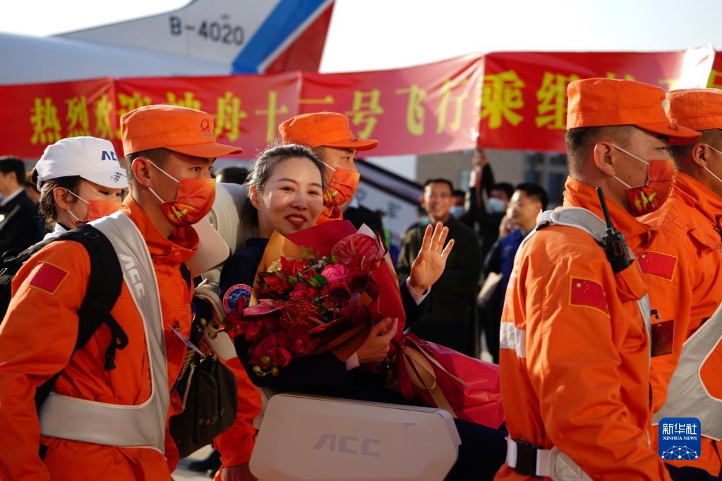 圆满完成神舟十三号载人飞行任务的航天员翟志刚、王亚平、叶光富,于2022年4月16日下午乘坐任务飞机平安抵达北京。空间站阶段飞行任务总指挥部领导和成员到机场迎接。