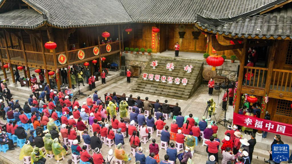 4月15日,在石柱县中益乡华溪村,村民在“分红大会”上。