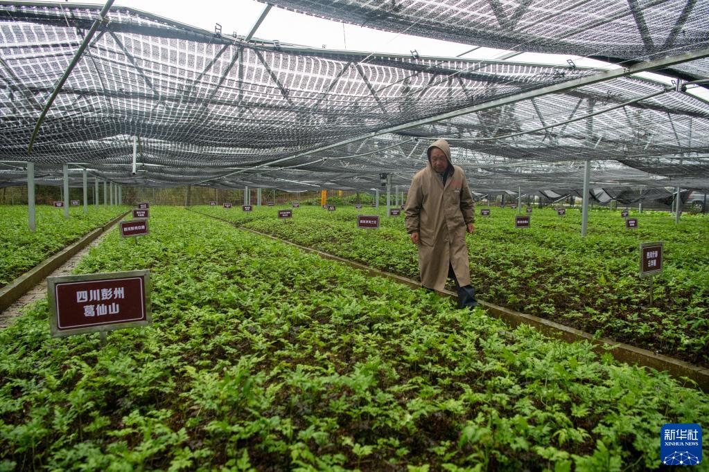 4月15日,在石柱县黄连科研基地,工作人员查看黄连生长情况。石柱黄连人工栽培历史悠久。