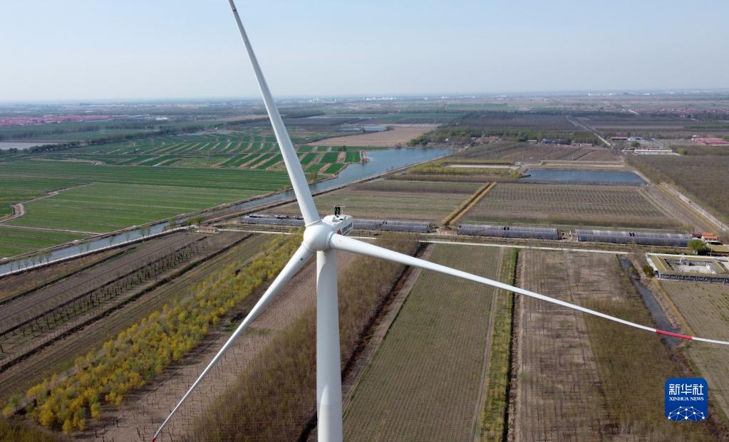 在位于天津市滨海新区的国家能源集团龙源电力汉沽风电场,刘彦波和同事胡众银对风机进行检修作业(4月13日摄,无人机照片)。